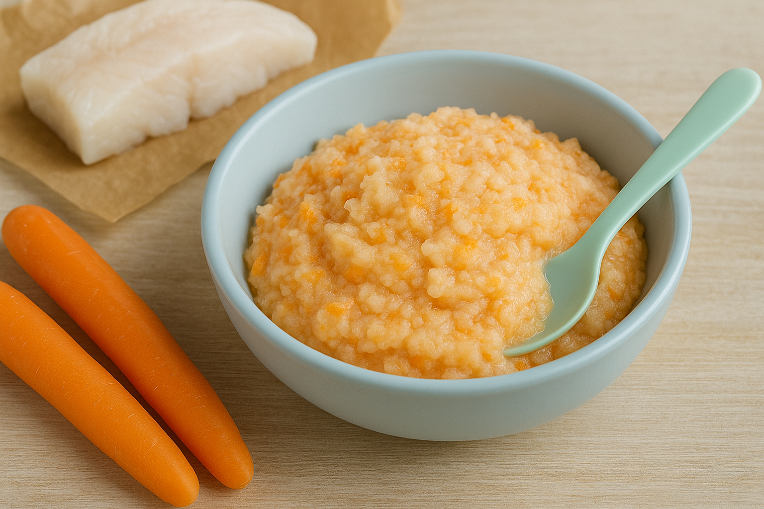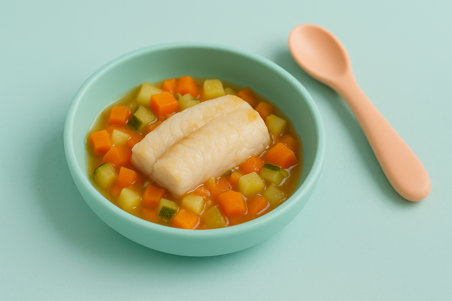 - Детям, которые только знакомятся с текстурами, можно частично размять овощи и рыбу вилкой. Детям старше года подавать кусочками.