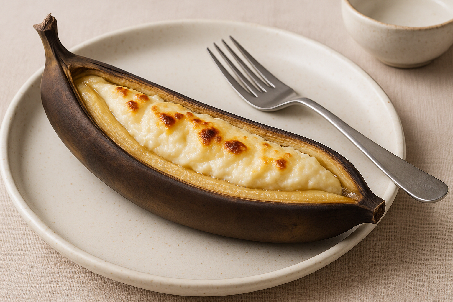 - Запекать 15 минут, пока банан не станет мягким, а сыр слегка уплотненным.