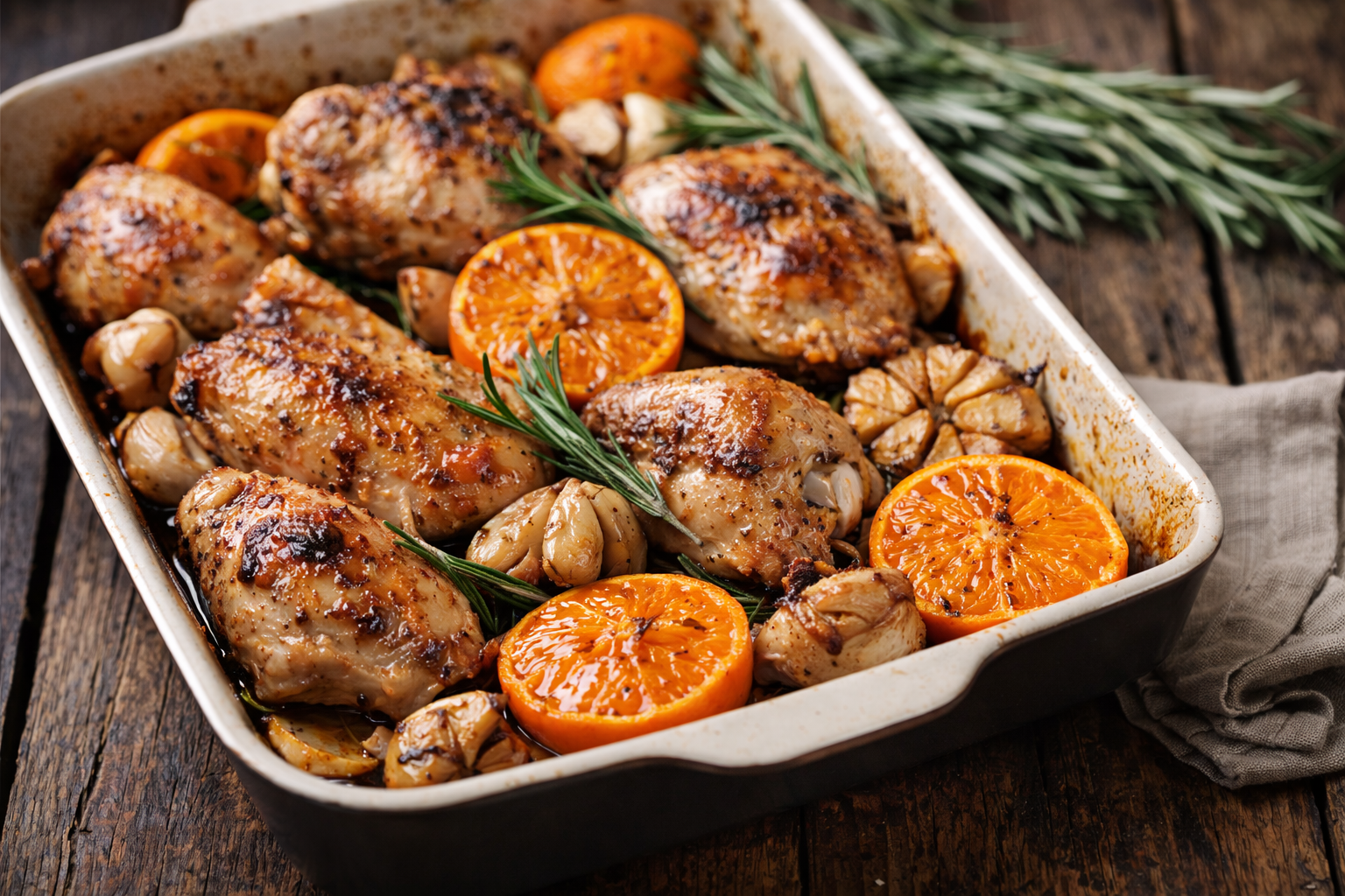Курица, запеченная с мандаринами, чесноком и розмарином.