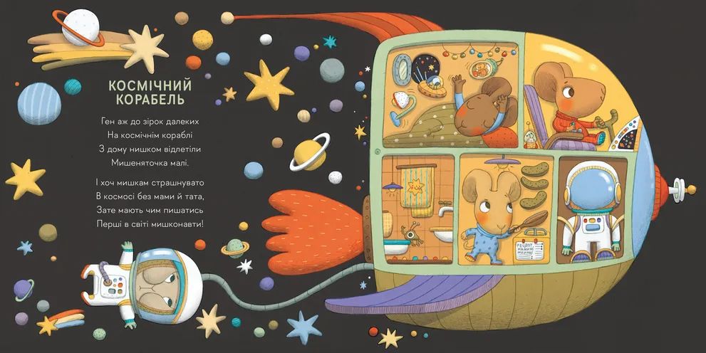Разом з її героями книжки малята прокатаються у київському метро і фунікулері, побувають у космосі з мишконавтами, а з жабками політають на дирижаблі.