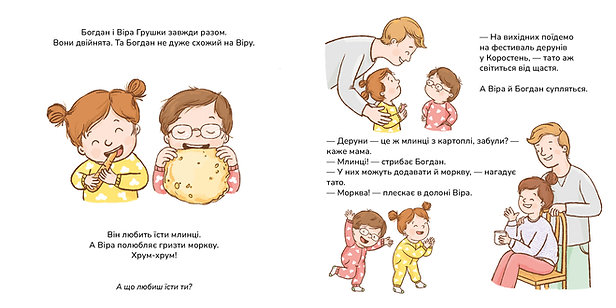 Богдан і Віра Грушки — герої серії книжок для дітей про дорослішання. Вони брат і сестра, та не надто вже й схожі між собою. У кожній книзі ми пізнаємо їх ближче, дізнаємося, які в наших героїв улюблені іграшки, спосіб дозвілля, хто з них любить ходити в парк довгою стежкою, а хто короткою.